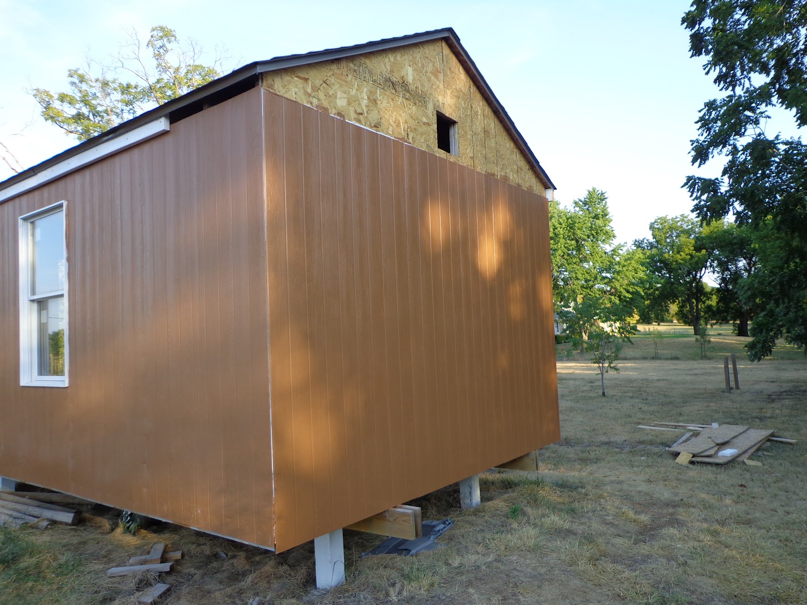 This is the east end, where the "people" door will be located.  He put the siding and flashing up on both ends, and got both ends painted.  Here you see the gable end going up.  There is a hole under the middle piece for the vent... he will cut it out soon.