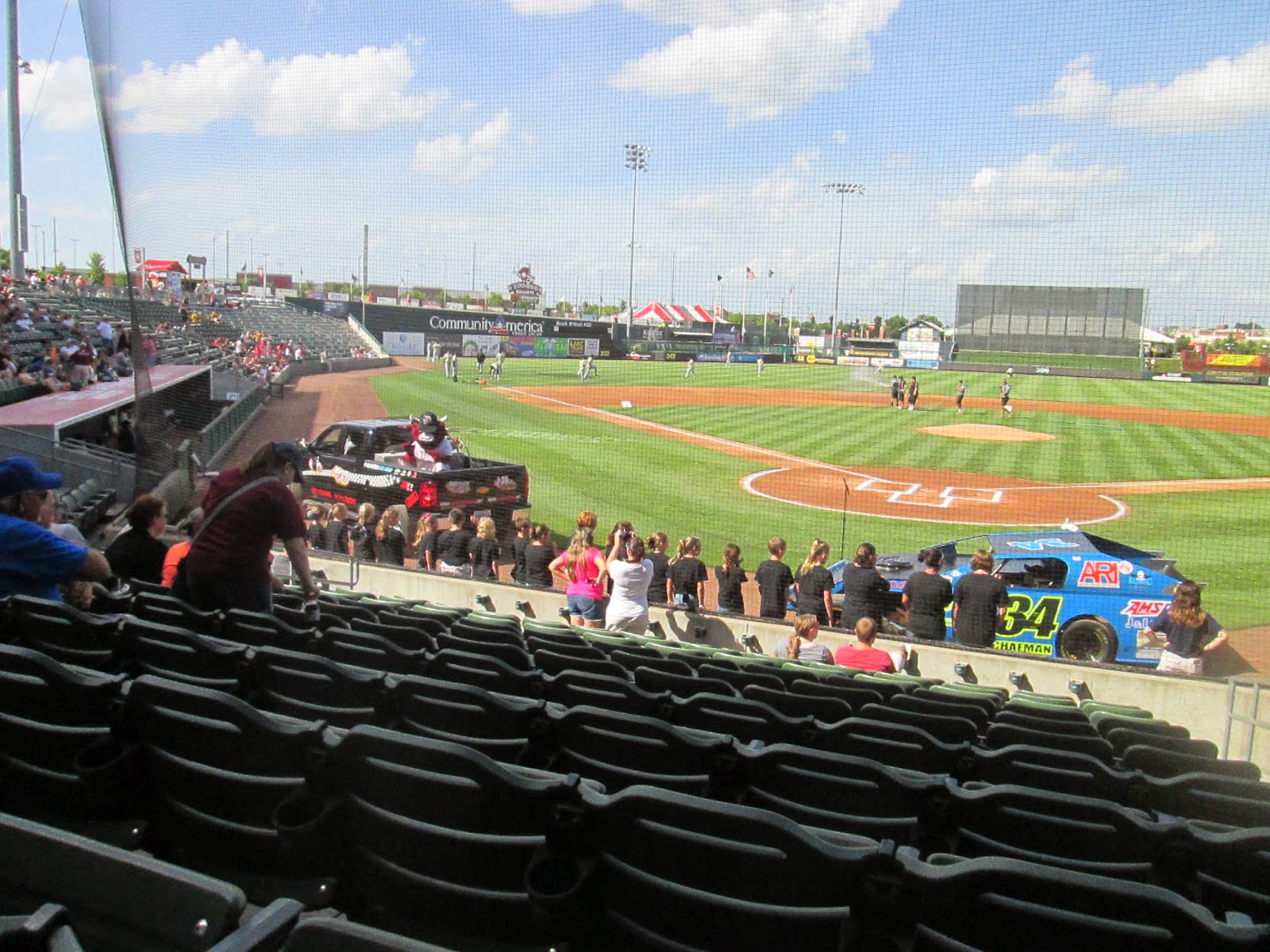 And there goes Team Mascot Sizzle, waving to everyone from the back of the Lakeside Speedway truck... while two race cars were exhibited. The kids in black stepping out of the way were there to sing the National Anthem.