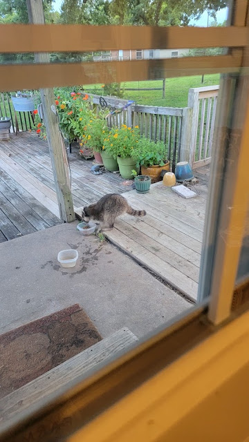 I leave a tiny pile out for the cats when I take the food up at night, you see the raccoons are eating it. Mama does not let the littles have any if she wants it, that one on the right is begging her.